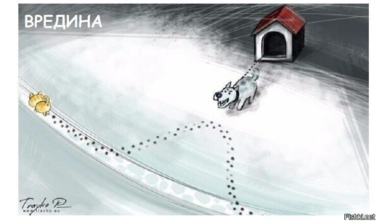 Во первых, сидячая на цепи собака отпустила колбасу, которую она должна была в полёте проглотить.
