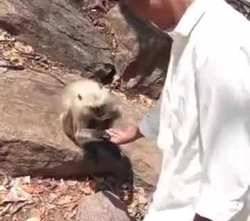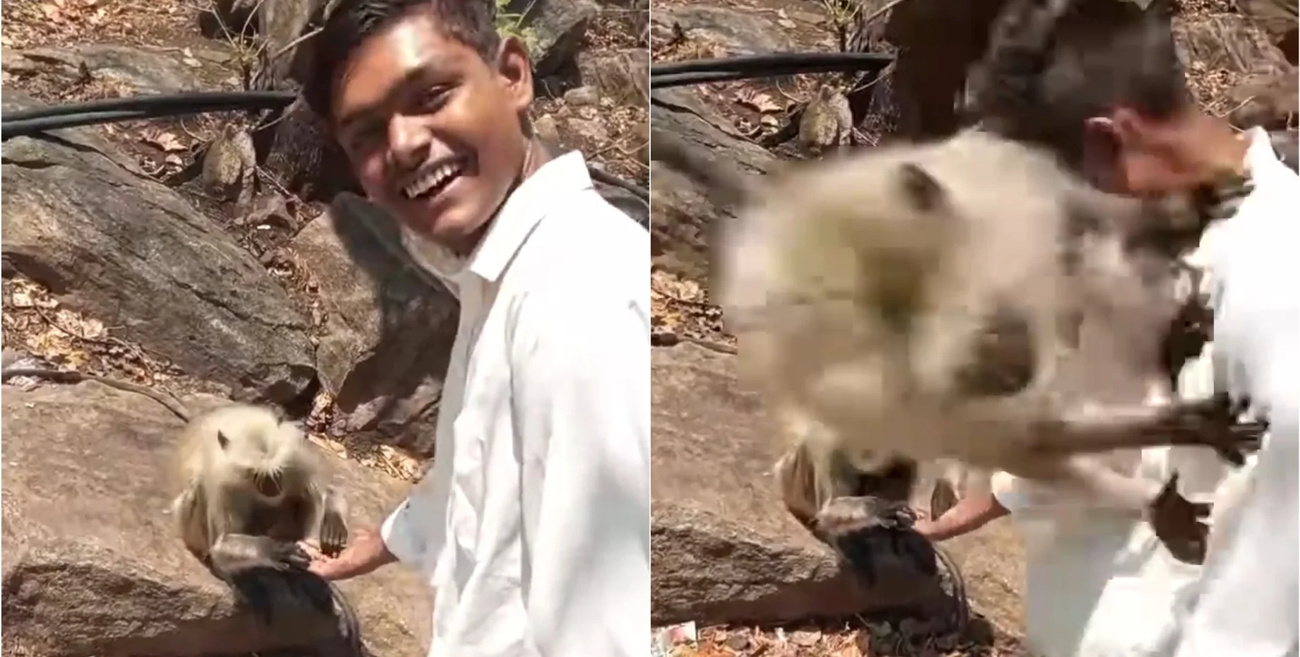 В одном из парков Азии мужчина решил покормить обезьянку из собственных рук. Буквально сразу это привело к немедленной реакции, когда в эту идиллию вмешалась еще один представитель обезьяньих.