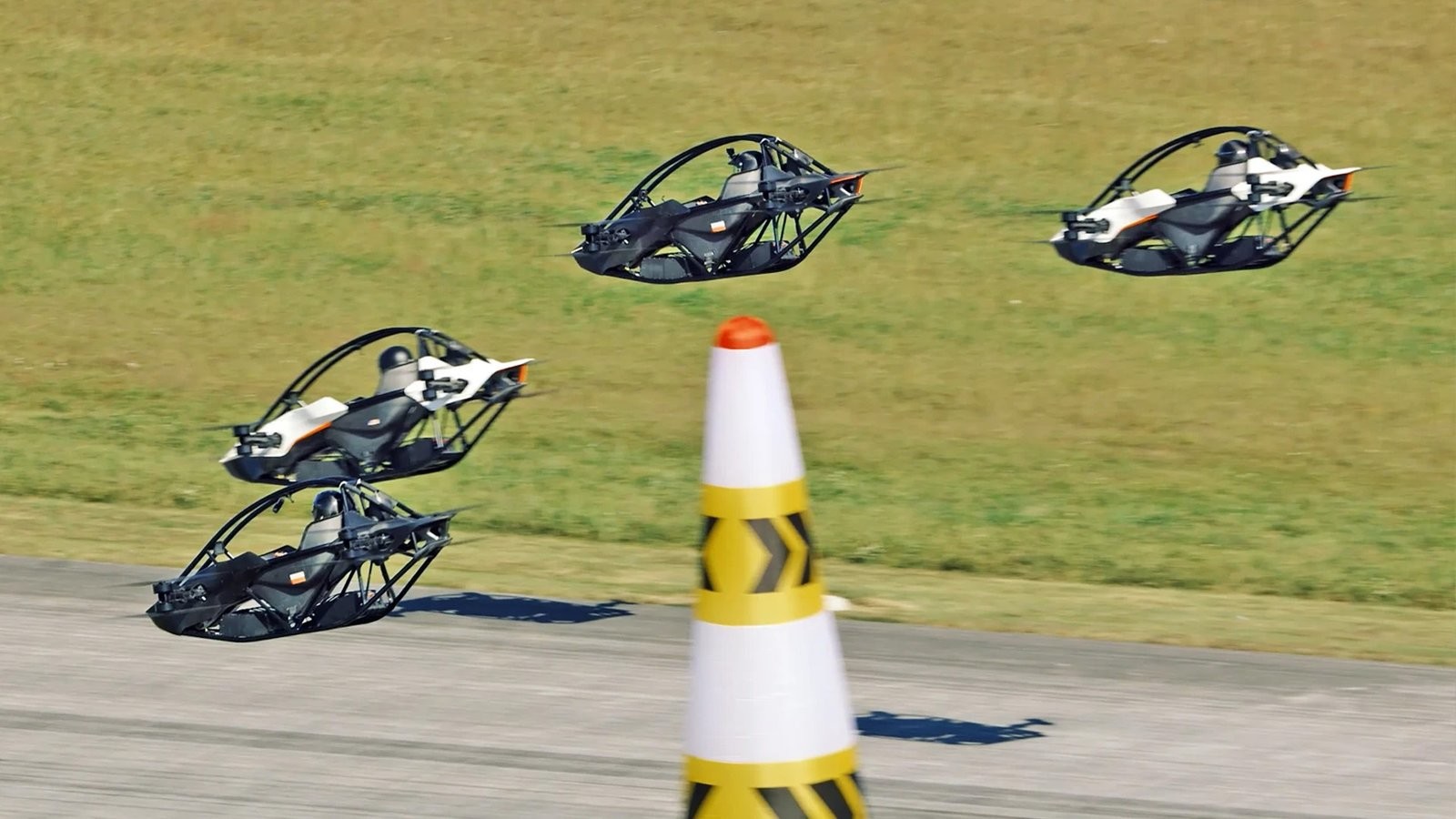 Компания Jetson показала, как четыре одноместных мультикоптера летят синхронным строем, а потом устроила настоящую гонку на высокой скорости. Всё происходило на транспортном саммите UP Summit в Арканзасе, где официально запустили Jetson Air Games. Это воздушные гонки, где пилот несется на скорости 102 км/ч, огибая пилоны.