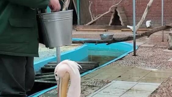 Пеликан Аркадий из Самарского зоопарка лакомится рыбкой.