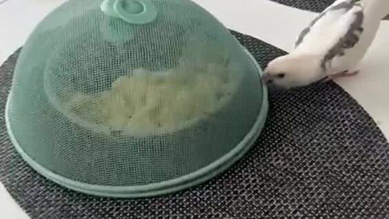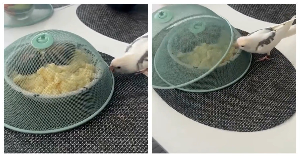 Попугай корелла попытался добраться до еды в тарелке. Хозяин питомца перехитрил его.