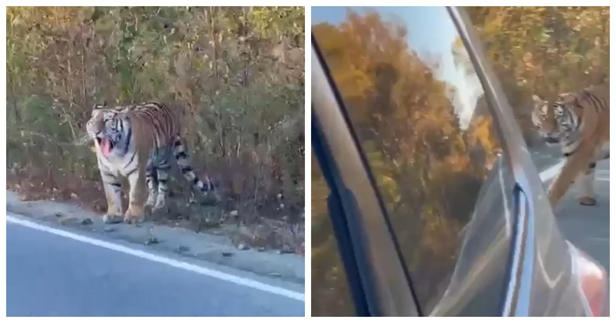 - Тигр вышел на дорогу и начал преследовать автомобиль
