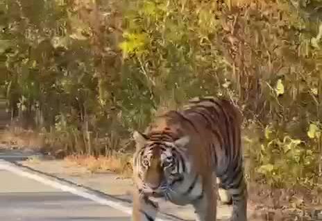 На записи от 20 октября видно, что тигр неспеша гуляет по полю травы. Заметившие его люди остановились и посигналили, но полосатый не дал никакой реакции. Позже он немного осмотрелся, никак на людей не отреагировав.