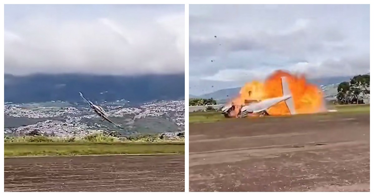 На кадрах видно, как самолёт при взлете теряет управление, переворачивается в воздухе, затем касается земли и спустя мгновения взрывается.