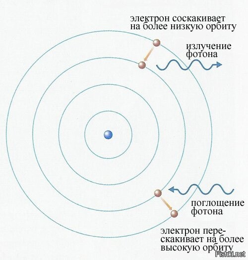 В какой то момент времени электрон переходит на уровень с более низкой энергией и при этом он излучает фотон.