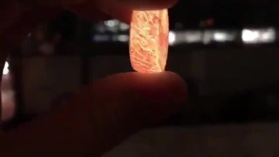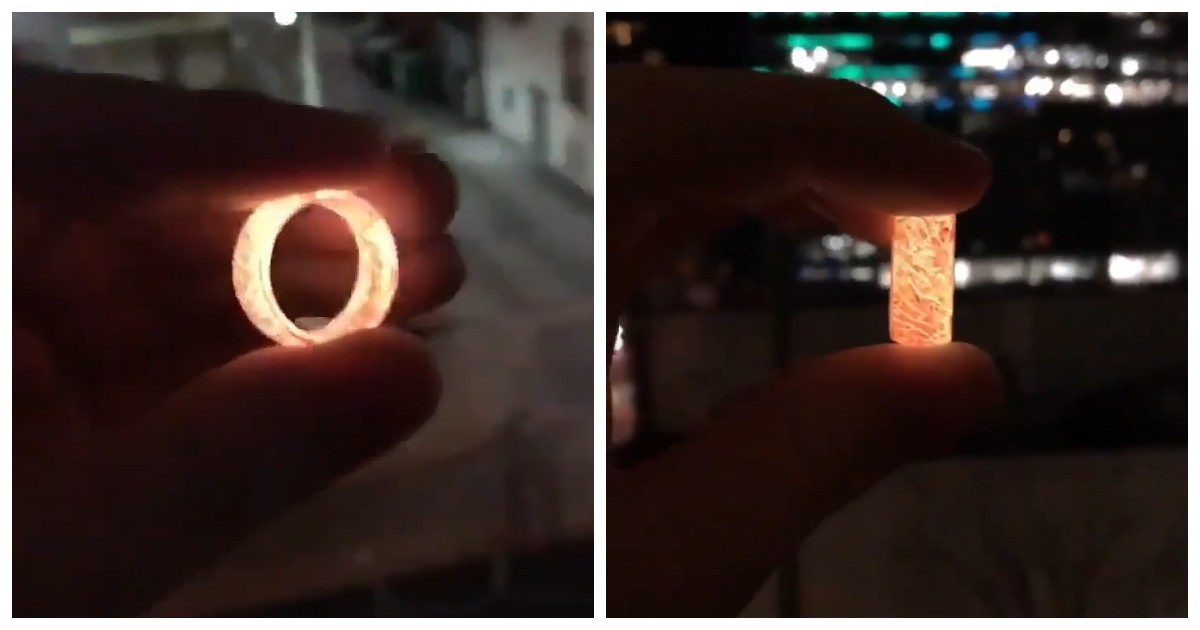 Это кольцо изготовлено из эпоксидной смолы, смешанной с порошком алюмината стронция — вещества, способного накапливать световую энергию. После воздействия света материал медленно излучает её в виде мягкого свечения в течение нескольких часов.