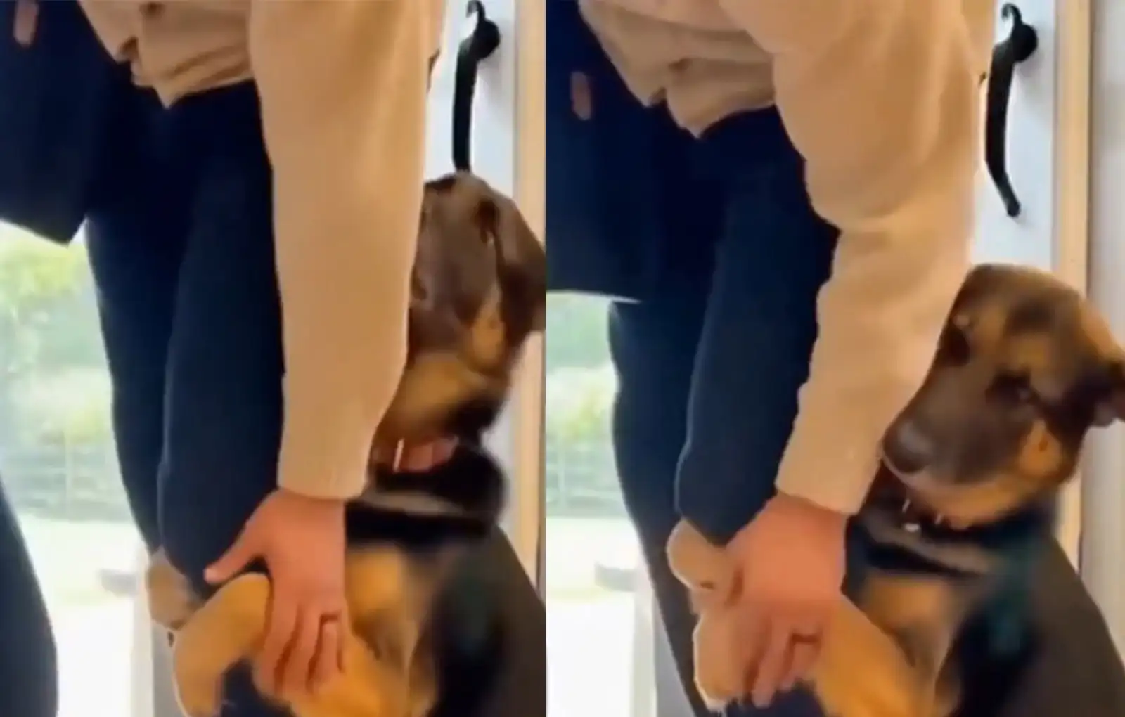 Четвероногий друг человека не хочет отпускать хозяина на работу, и всеми силами пытается его удержать