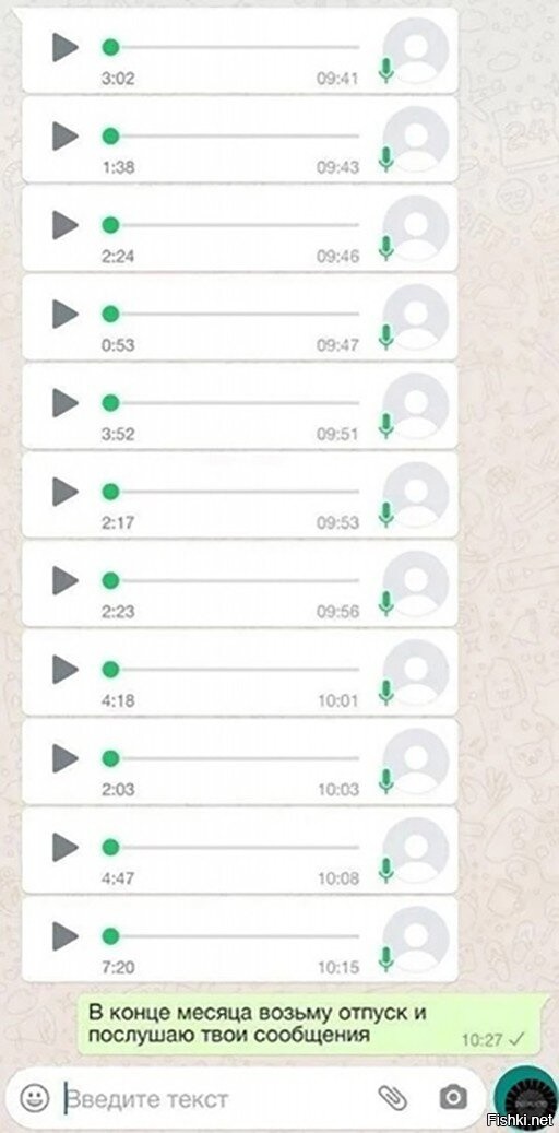 Как-то раз мне окончательно "припекла" с ней переписка, были пару мозга ё.б.ных моментов, написал обычным текстом: "мы разговариваем на разных языках, нам больше не по пути". В ответ пришла "голосовуха" длиной 14 минут - это был рекорд.