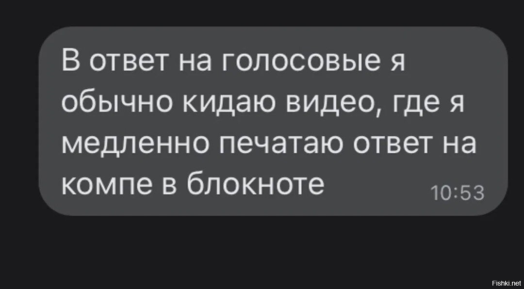 Как-то раз мне окончательно "припекла" с ней переписка, были пару мозга ё.б.ных моментов, написал обычным текстом: "мы разговариваем на разных языках, нам больше не по пути". В ответ пришла "голосовуха" длиной 14 минут - это был рекорд.