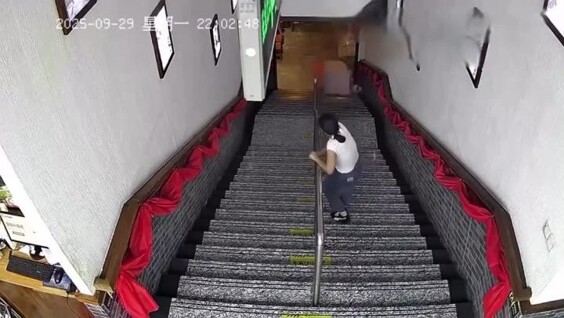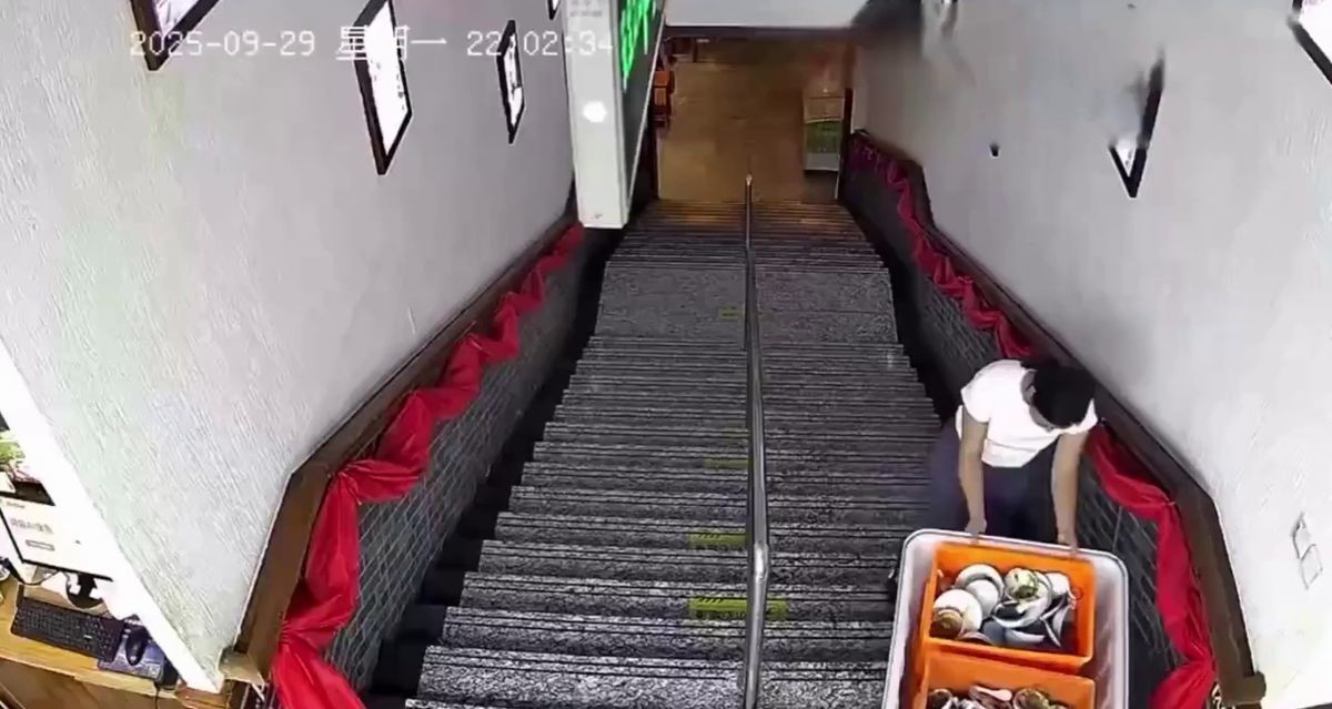 Девушка решила спустить с лестницы контейнер, набитый посудой и столовыми приборами. Казалось бы, что могло пойти не так?