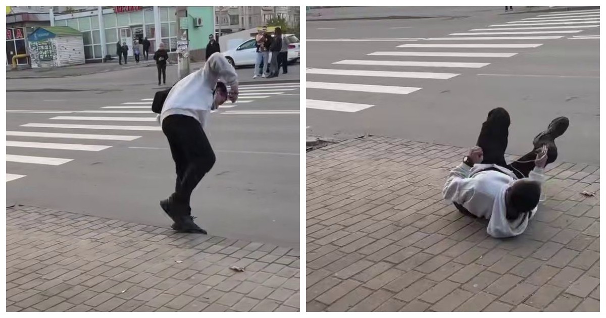 Прохожие сняли, как парень слушал музыку в наушниках и устроил совершенно странный танец: падения, перевороты — всё как часть шоу прямо на автобусной остановке!