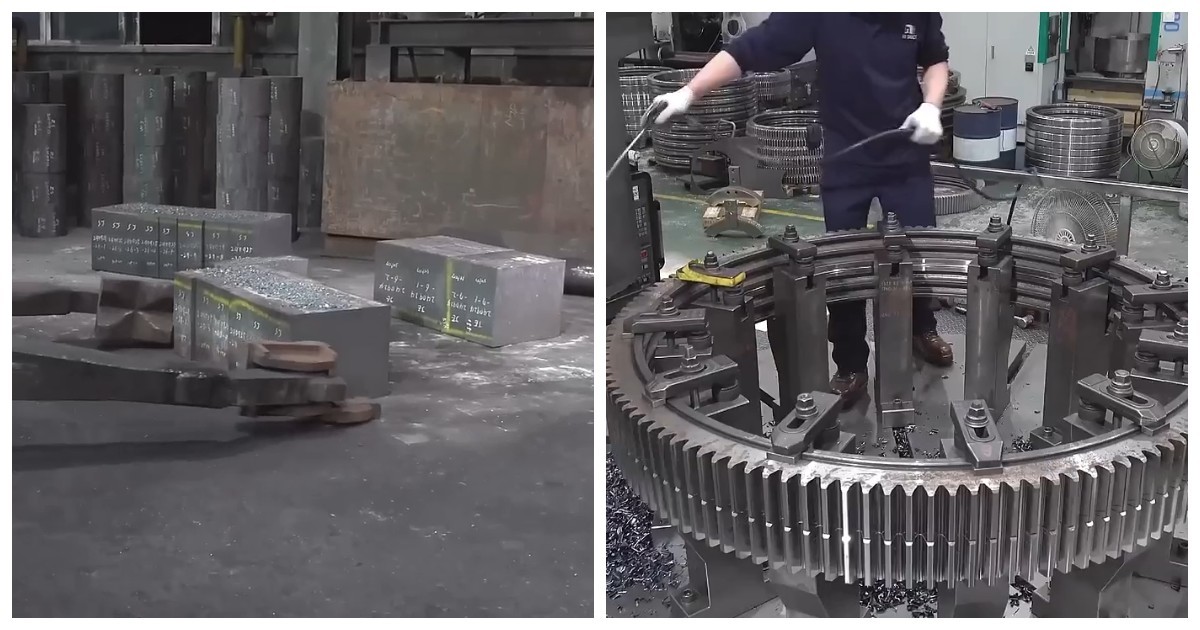 Смотрите уникальный процесс изготовления огромных поворотных подшипников — от заготовки металла до готового изделия. Настоящая инженерная мощь и точность в каждой детали!