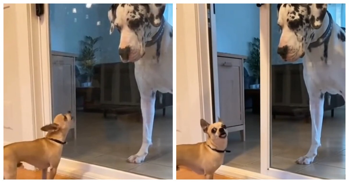 Маленькая собачка громко лаяла на другую собаку через стеклянную дверь… но как только дверь открылась, её уверенность испарилась!