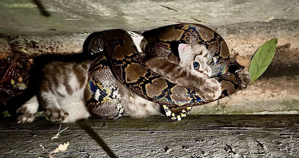 Житель Сингапура Маркус Ли пришёл на помощь кошке, которую пытался сжать в смертельных объятиях питон. Житель Сингапура Маркус Ли шёл вечером по улице и услышал странные звуки в кустах. Подойдя поближе он обнаружил кошку, которую пытался сжать в смертельных объятиях питон.