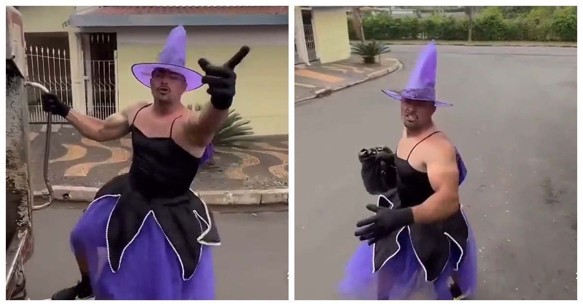 В одном из районов Бразилии сборщик мусора решил сделать свой рабочий день необычным. Он надел костюм ведьмы и исполнял ритмичные движения, превращая обычный маршрут по уборке улиц в яркое и праздничное представление.