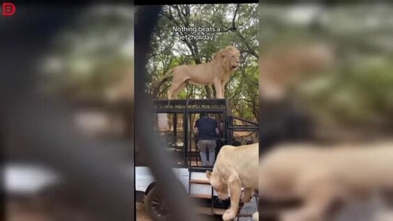 Группа путешественников наблюдала за львами из специального автомобиля. Один из хищников неожиданно поднялся на крышу машины и, устроившись прямо над людьми, метко оставил на них свой «след».
