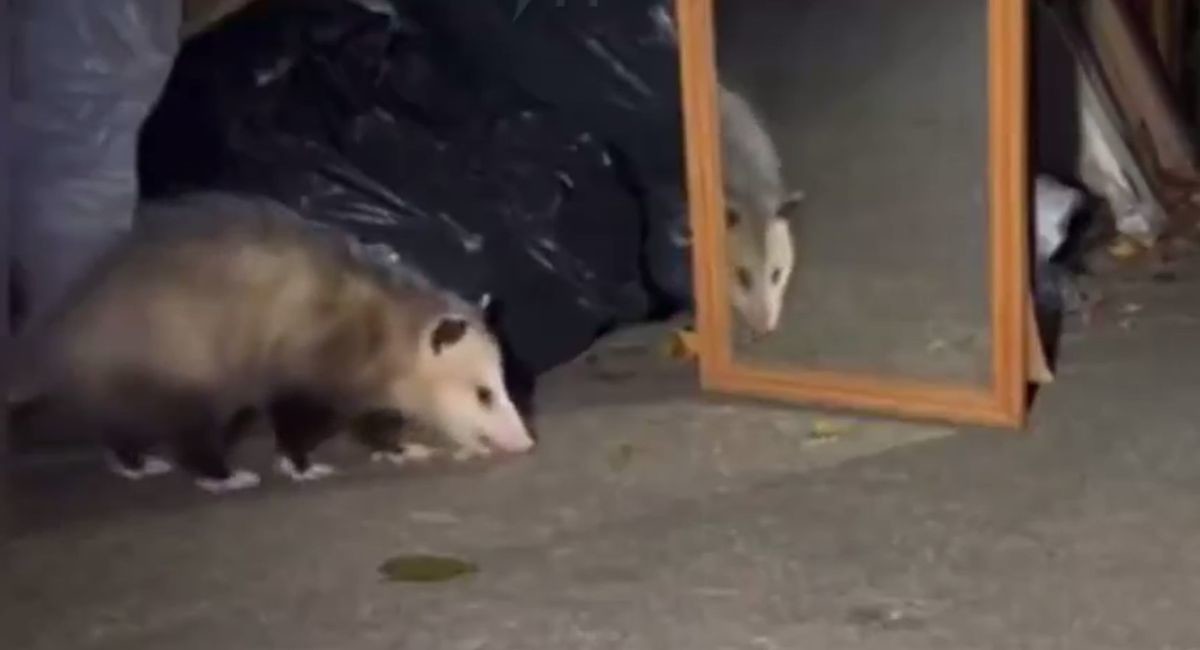 Опоссум случайно наткнулся на зеркало среди мусора, испугался и притворился мёртвым.