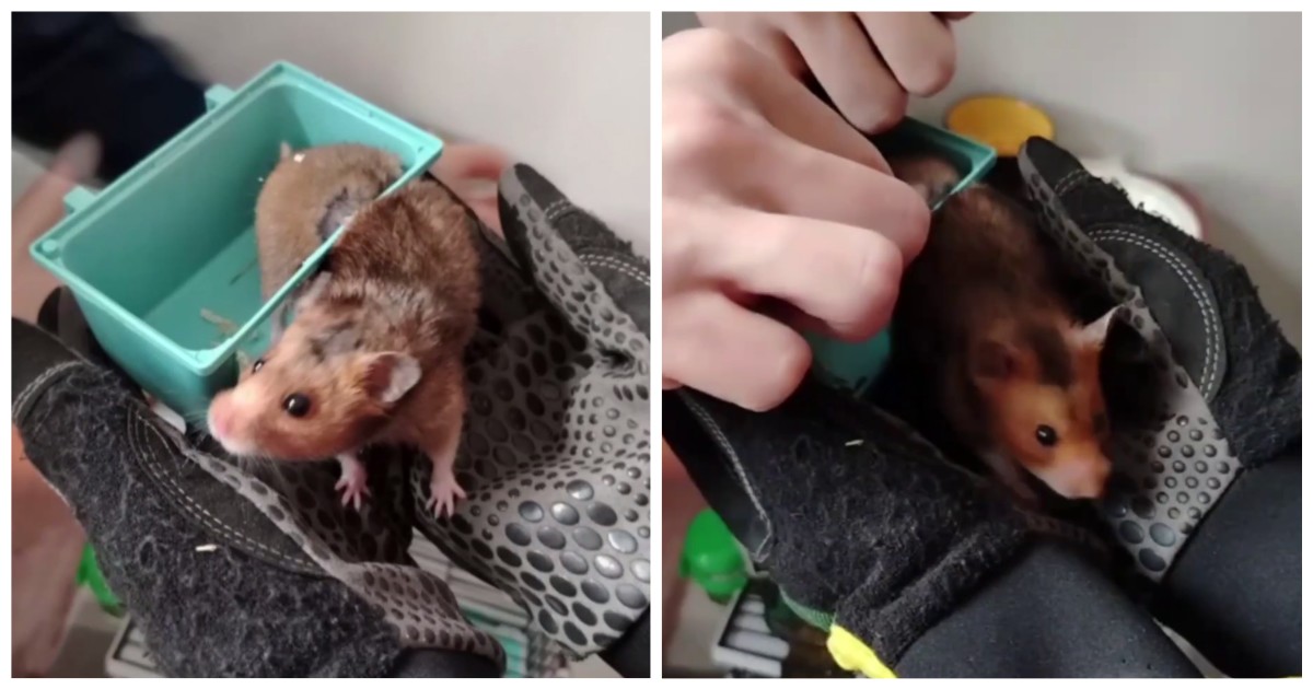 Толстенькая самка сирийского хомяка застряла в пластмассовом домике. Хозяева пытались помочь ей, но хомячиха выкручивалась и кусалась. Пришлось обращаться к профессионалам. Московские спасатели аккуратно разрезали пластик и освободили зверька без травм.
