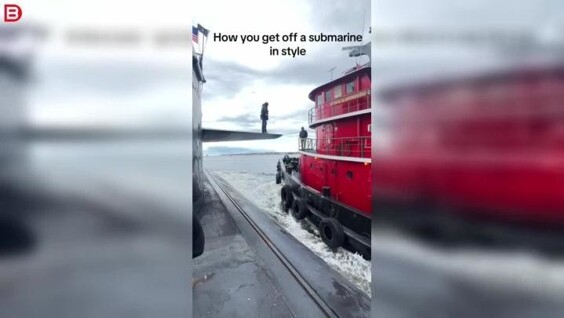 На кадрах видно, как мужчина с сумкой стоит на «крыле» подводной лодки — крупной субмарины — и наблюдает, как к ней медленно подходит второй корабль. Благодаря слаженной работе экипажей лодка занимает почти идеальное положение, и мужчина делает несколько шагов, переходя с одного судна на другое.
