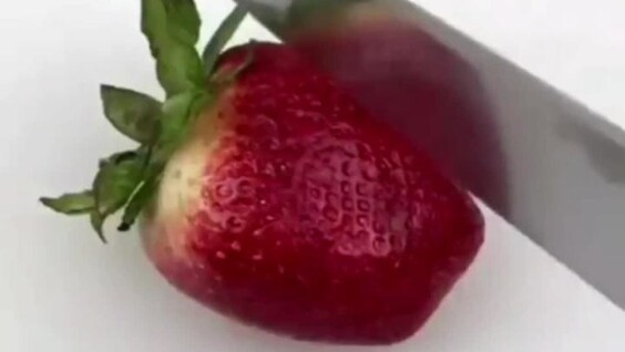 Рука кондитера разрезает различные овощи и фрукты, но внутри вместо привычной мякоти оказывается нежнейший бисквит.