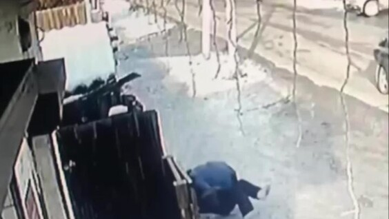 На кадрах видно, как ребёнок пытается увернуться и убежать от нападавшего, а мимо проезжают машины.