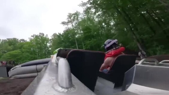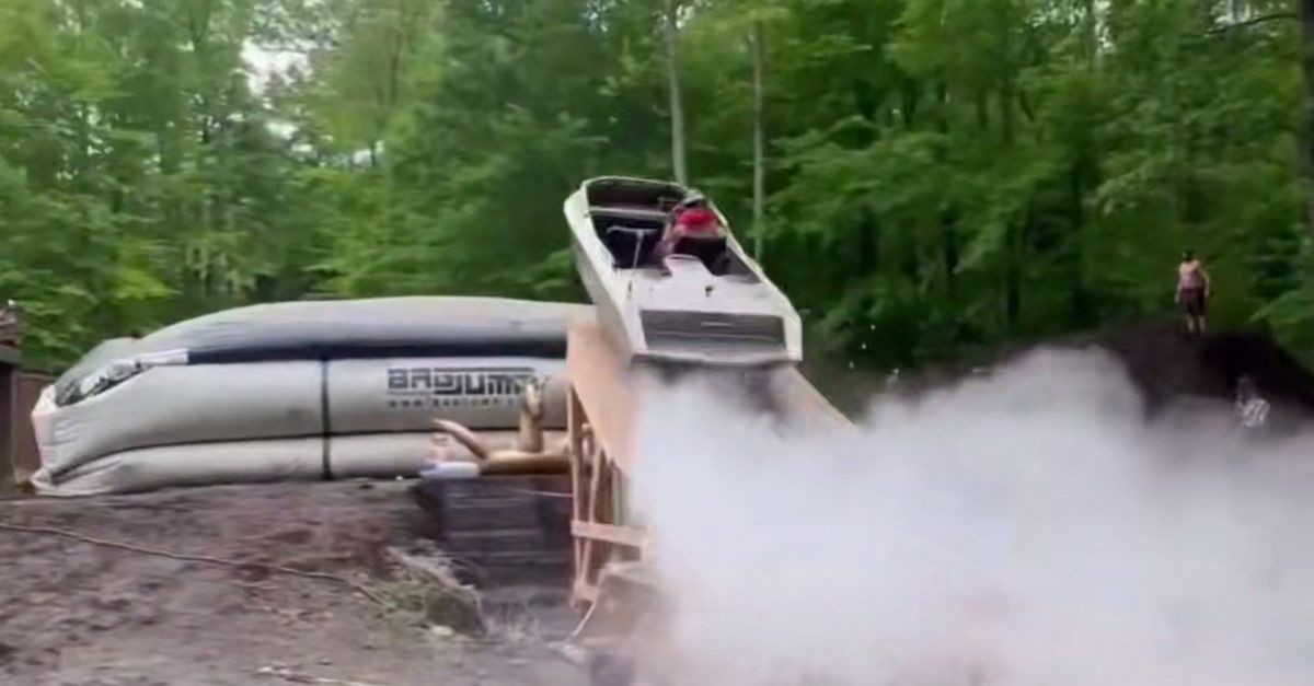 Американцы построили в лесу трамплин для моторной лодки с большой надувной подушкой на финише. Первый испытатель едва её не перелетел.