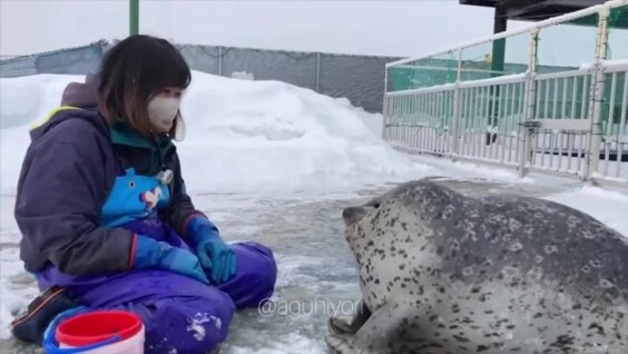 В сети набирает популярность забавное видео, снятое в японском зоопарке. Пользователей сети очаровал тюлень, который синхронизировался с сотрудницей.
