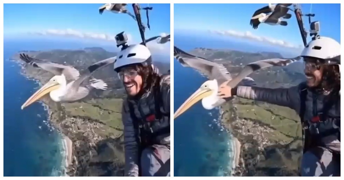 В Бразилии парапланеристу неожиданно составил компанию пеликан. Птица спокойно летела рядом, иногда подлетая совсем близко, будто проверяя нового знакомого. Получился редкий момент, когда человек и дикая птица почти синхронно движутся в потоке воздуха, словно это их общий полёт.
