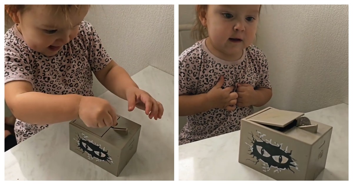 Реакция девочки на необычную копилку. Рука неизвестного монстра крадёт монетку.