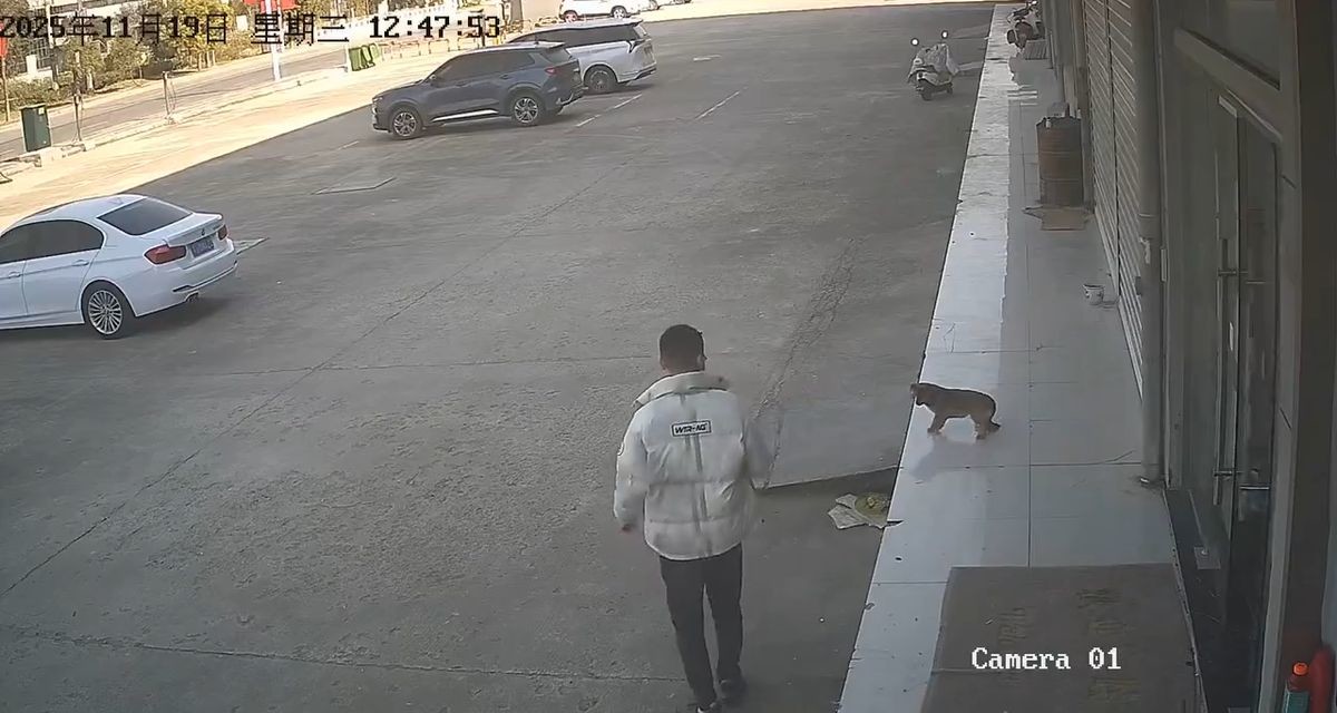 Житель Китая вышел из здания и увидел маленькую собаку. Он заметил, что животное боится людей и решил усилить этот эффект.