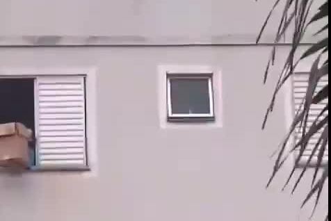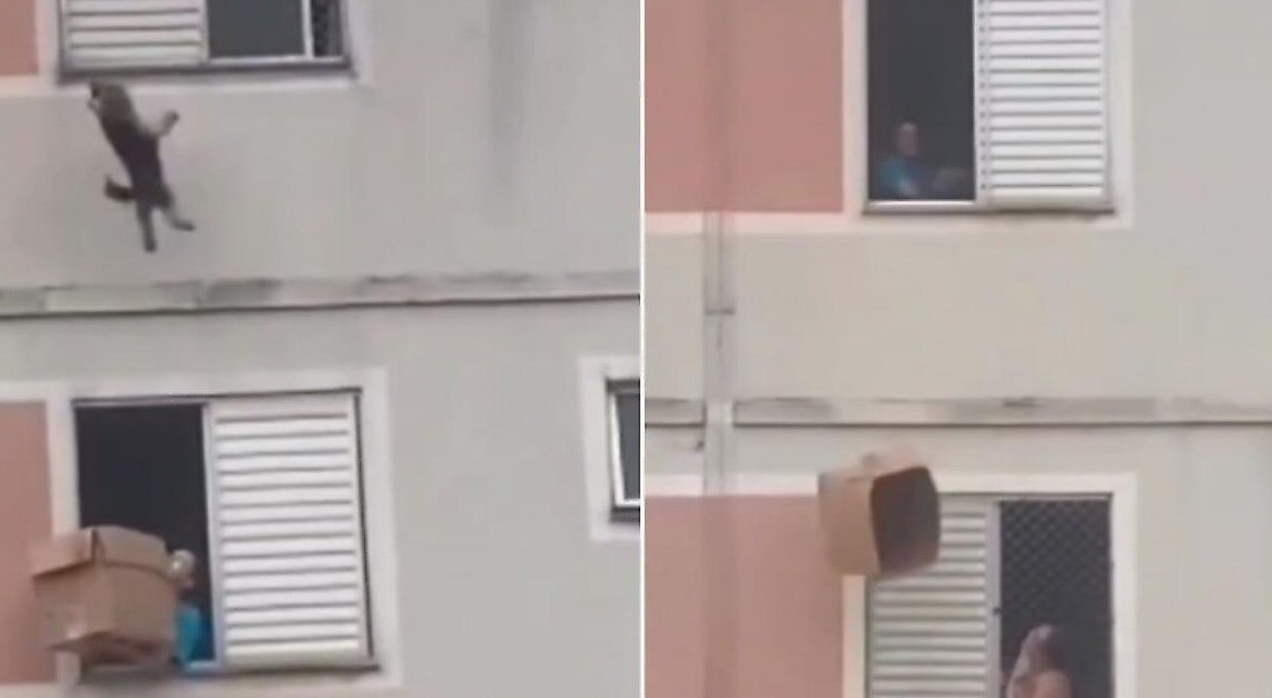 Житель бразильского города Гуарульюс стал свидетелем спасения пса. Женщина поймала четвероногого друга человека, упавшего с высоты.