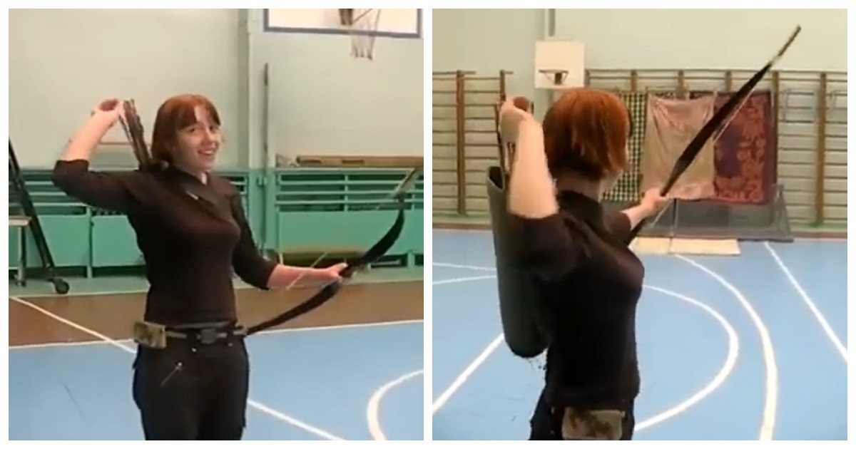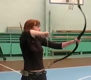 На видео девушка демонстрирует скоростную стрельбу из лука. Её движения плавные, точные и полностью отточенные, что подчёркивает высокий уровень мастерства и уверенности.