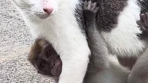 В Малайзии 8-месячная осиротевшая обезьяна обрела новую маму. Ей стала местная кошка. Теперь кошка постоянно носит примата на себе.