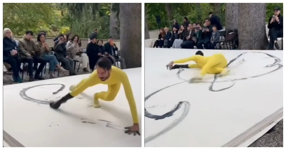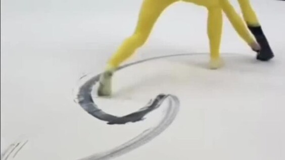 Человек в ярком жёлтом костюме выступает инструментом творчества, взаимодействуя непосредственно с поверхностью огромного белого полотна. Художник создает абстрактные линии и формы, используя собственное тело как кисть.