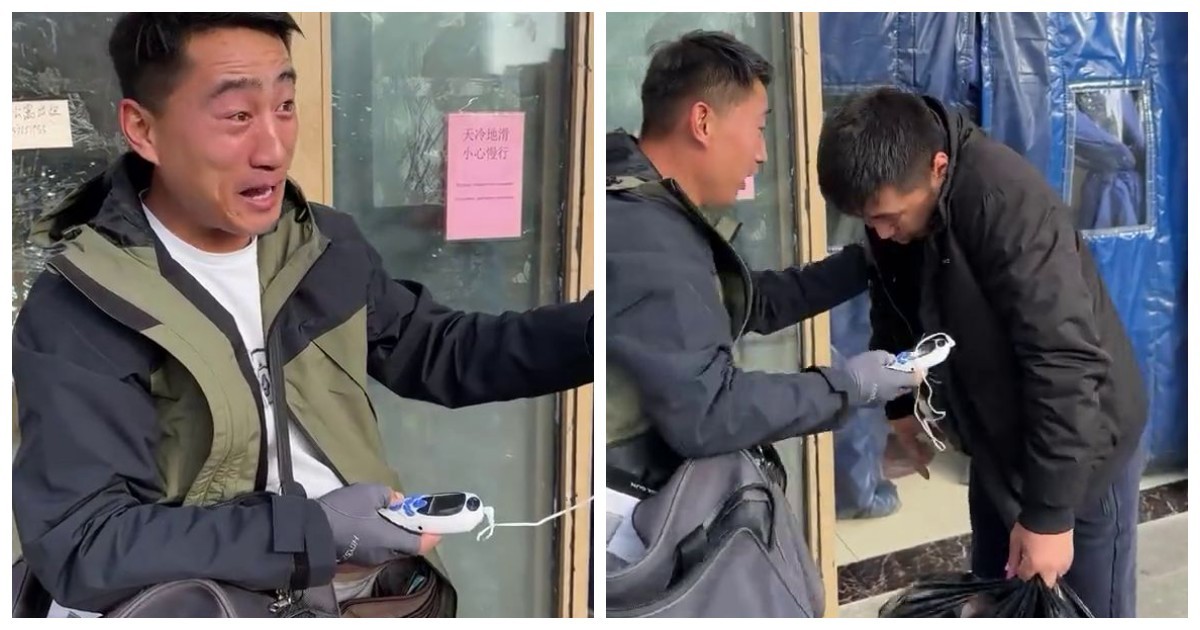 На улице продавец демонстрировал гаджет, и прохожий решил подшутить, притворившись, что его ударило током при использовании устройства.