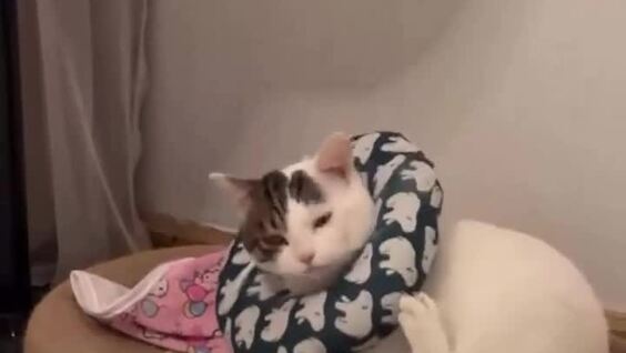 Кошка с защитным воротником, из которой получился бы идеальный загрузочный экран в какой-нибудь игре или программе. Надеюсь кто-то сделает окно загрузки с такой анимацией.