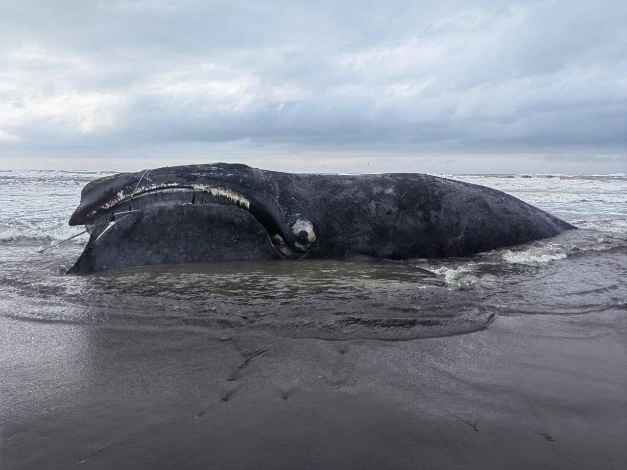 На его голове и рядом специалисты заметили верёвку — по предварительным данным, животное могло запутаться в сетях, что и привело к гибели.