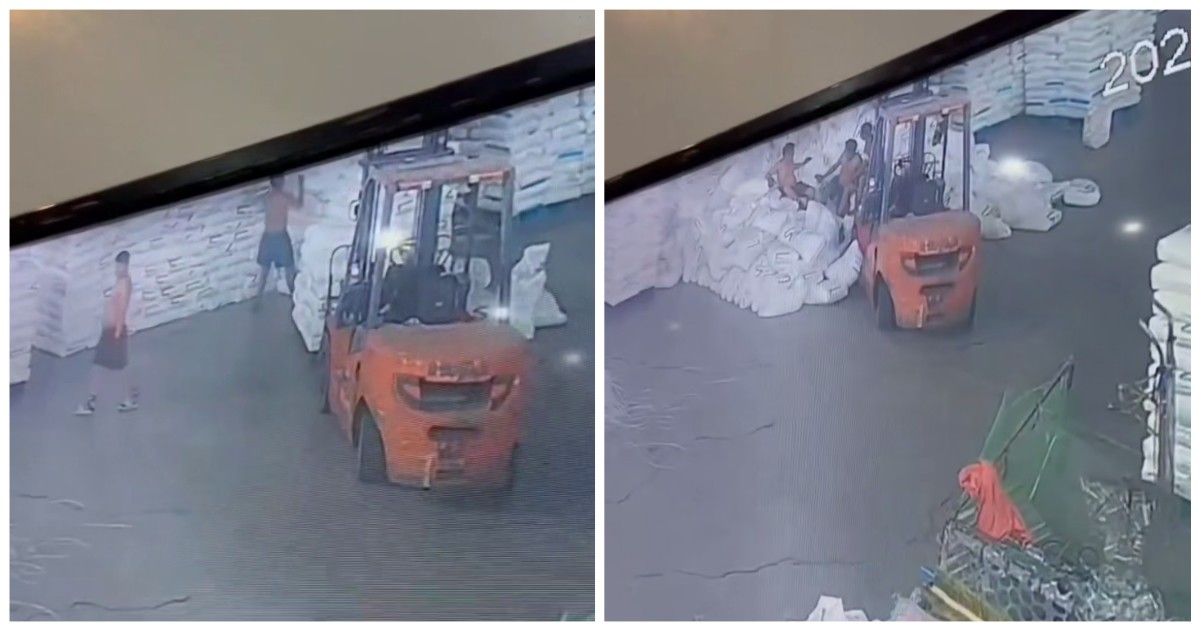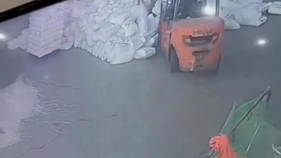 Тревожный инцидент произошёл в китайской провинции Аньхой во время плановой разгрузки на складе. На одного из рабочих обрушилось большое количество мешков — каждый весом около 25 килограммов. К счастью, рядом оказались его коллеги.