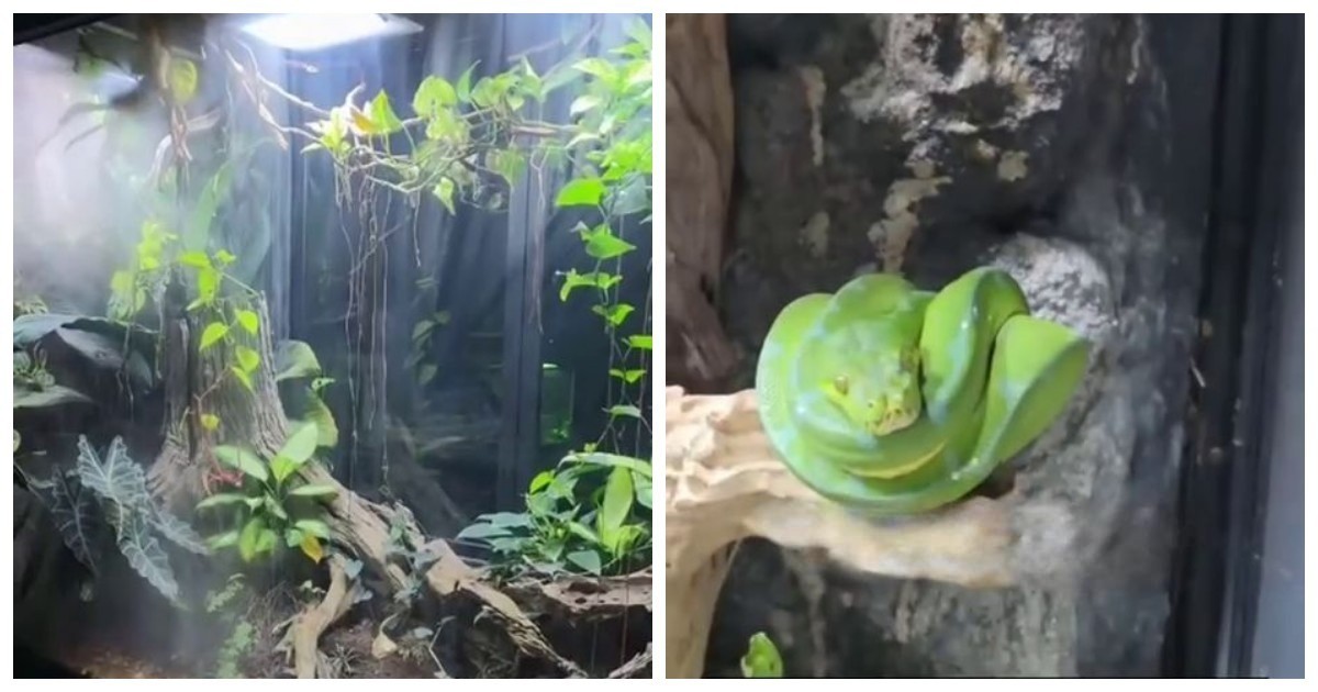 Автор видео продемонстрировал своё необычное хобби — огромную систему из нескольких связанных между собой биомов. Внизу у него расположен «тропический лес»: экзотические растения, грибы, рептилии, насекомые, черви, муравьи и даже змея.