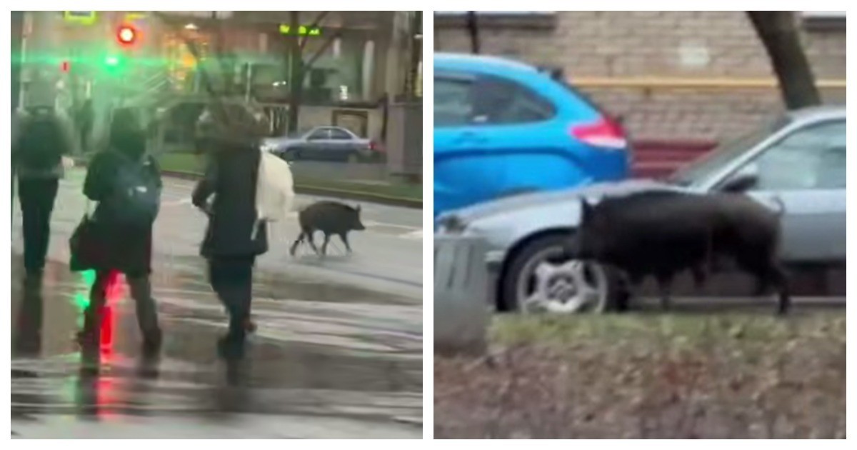 Жители северо-запада Москвы запечатлели кабана, прогуливающегося по улицам вблизи станции метро "Октябрьское поле".