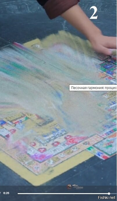 Это тибетская буддийская традиция, включающая создание и разрушение мандал из цветного песка. Ритуал отражает главную идею буддизма — все в мире непостоянно, ничто не длится вечно. Невероятно сложный рисунок создается часами, а иногда и днями, а затем его уничтожают одним движением кисти.