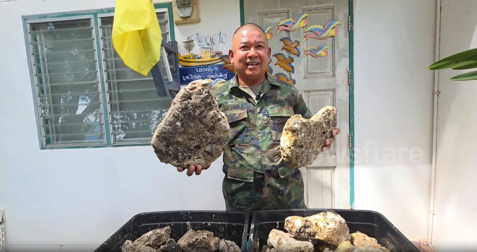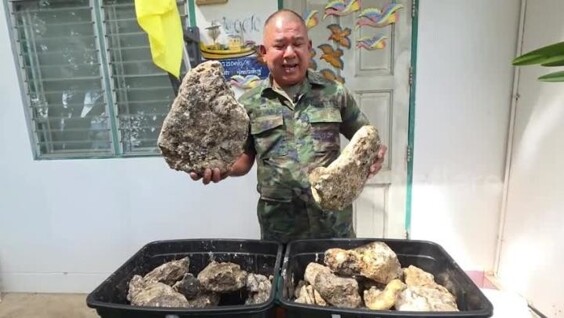 55-летний офицер Военно-морских сил (ВМС) Таиланда Краисом Нунпрадит выставил на продажу огромный сгусток амбры — редчайшего вещества, часто называемого рвотой кашалота. Об этом сообщает Newsflare. Вещество обладает слегка сладковатым запахом.