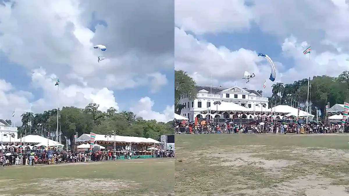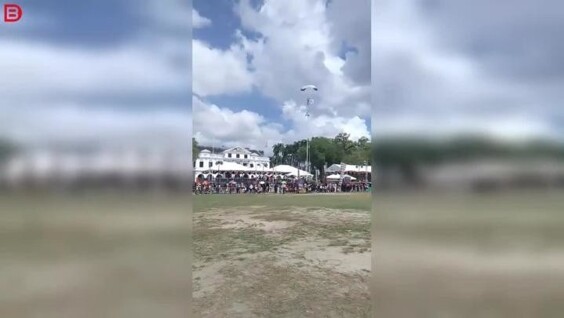 Во время фестиваля по случаю 50-летия свободы Суринама парашютист должен был эффектно приземлиться на площадку, но сильный встречный ветер сорвал идеальный план. Вместо плавной посадки он жёстко рухнул на землю.