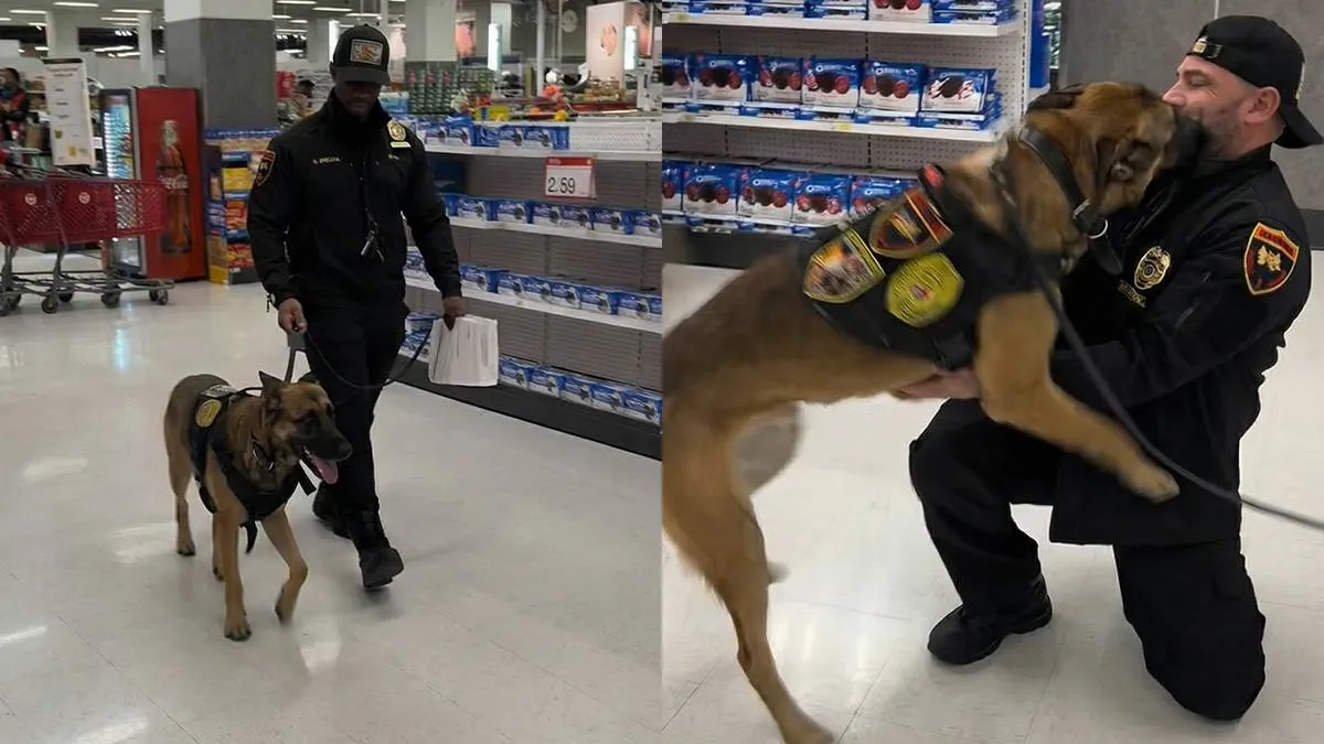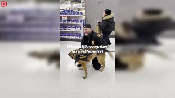 Во время визита в магазин служебная собака К9 неожиданно встретила своего прежнего хозяина. Несмотря на строгую выучку и дисциплину, пёс сразу узнал человека и мгновенно сменил рабочий настрой на дружелюбный, проявив всю свою привязанность.