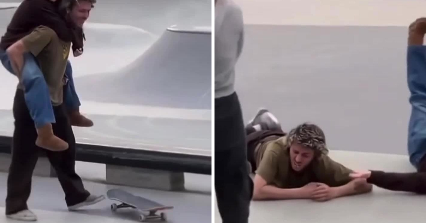 Американец решил впечатлить компанию и прокатиться на скейте с девушкой, которая сидела у него на спине. Но лишний вес нарушил баланс: он мгновенно потерял контроль, скейт уехал в сторону, а сам он приземлился лицом прямо на бетон.