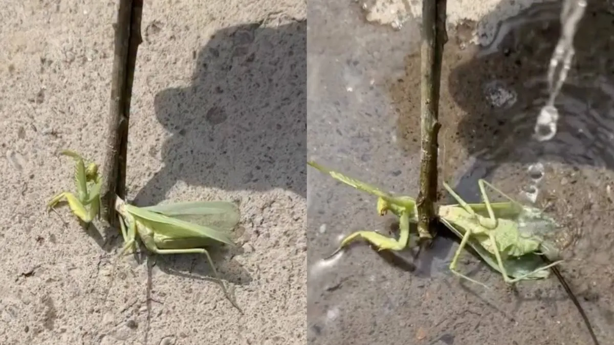 На видео показан необычный паразит, напоминающий длинную тонкую прядь волос длиной до 30 см. Он обитает на теле богомола и внешне похож на оживший конский волос. Парень использует палку и воду, чтобы осторожно удалить этого странного «волосатика» и освободить насекомое.
