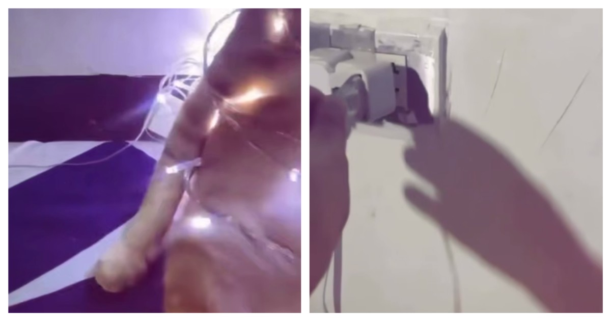 Хозяин кота обмотал своего питомца гирляндой и подключил ее к розетке. Получилось праздничное украшение с двигающимися огоньками и выразительной мимикой.