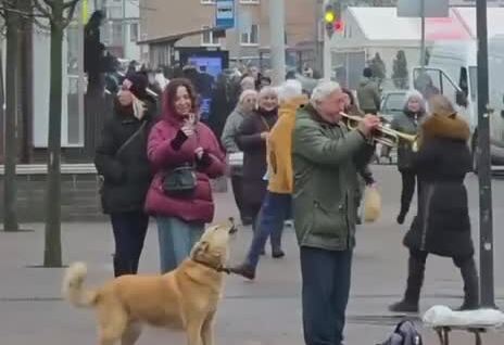 В Калининграде собака решила подпеть музыканту, играющему на трубе. На данный момент неизвестно, является ли мужчина хозяином собаки, или же дуэт получился спонтанным.