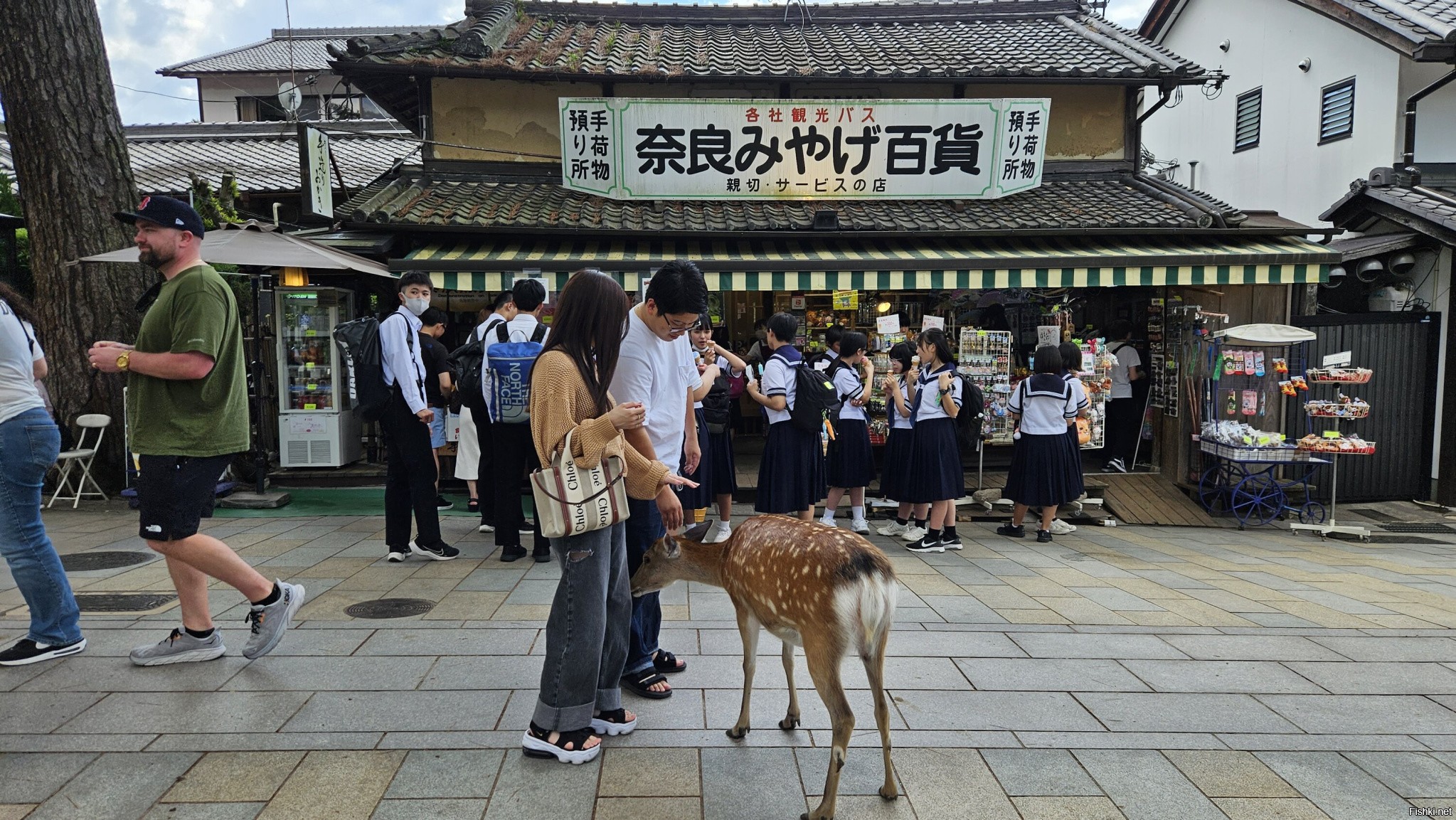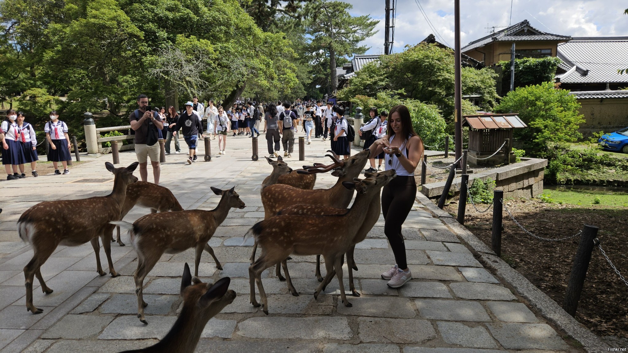 В Нара, где олени свободно ходят среди людей, туристка попыталась отпугнуть подошедшего к ней животного ногой. Олень воспринял это как агрессию и боднул девушку, напомнив, что местных оленей важно не провоцировать.