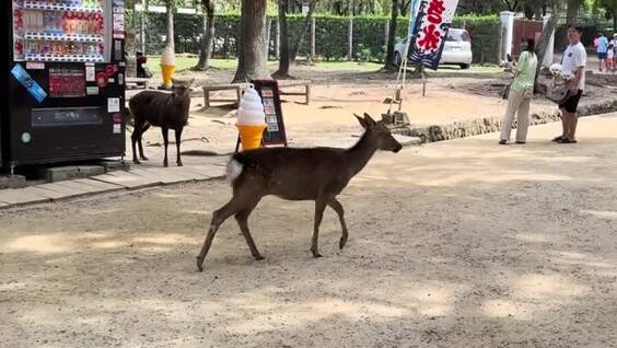 В Нара, где олени свободно ходят среди людей, туристка попыталась отпугнуть подошедшего к ней животного ногой. Олень воспринял это как агрессию и боднул девушку, напомнив, что местных оленей важно не провоцировать.